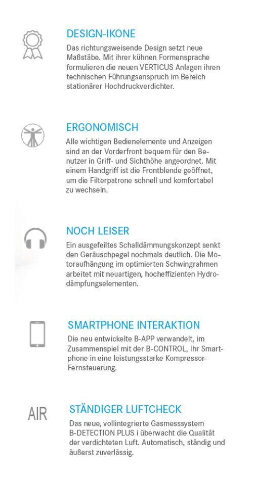 STATIONÄRE VERDICHTER - NEU ERFUNDEN Die neue MINI-VERTICUS & VERTICUS Anlagenreihe setzt den künftigen Standard im Bereich stationärer Hochdruck-Verdichteranlagen. Sie vereint die Qualität und Zuver- lässigkeit der bisherigen stationären Anlagenreihe mit komplett neuem Design, B-APP-Anbindung ans Smartphone, Online-Luftqualitätsmes- sung und hervorragender Ergonomie. Besonders der neue MINI-VERTICUS profitiert trotz seiner Kompaktheit von der Konstruktionsidentität. Zudem: Zahlreiche Zubehörvarianten der größeren VERTICUS Reihe, beispielsweise die Steuerung B-CONTROL II, stehen jetzt ebenfalls zur Verfügung. Ausgestattet mit einer ferngesteuerten Bedienung und Kontrolle über die B-APP (optional). Mit einer intelli- genten, äußerst zuverlässigen und extrem exakten internen Online- messung, die rund um die Uhr die Einhaltung aller Schadstoffgrenzwerte in der Luft überwacht und im Zweifel einen automatischen Anlagenstopp veranlasst. Mit einem deutlich leiseren Betrieb, mit hervorragender Ergonomie und einer Bedienerfreundlichkeit, die ihresgleichen sucht. Mehr…