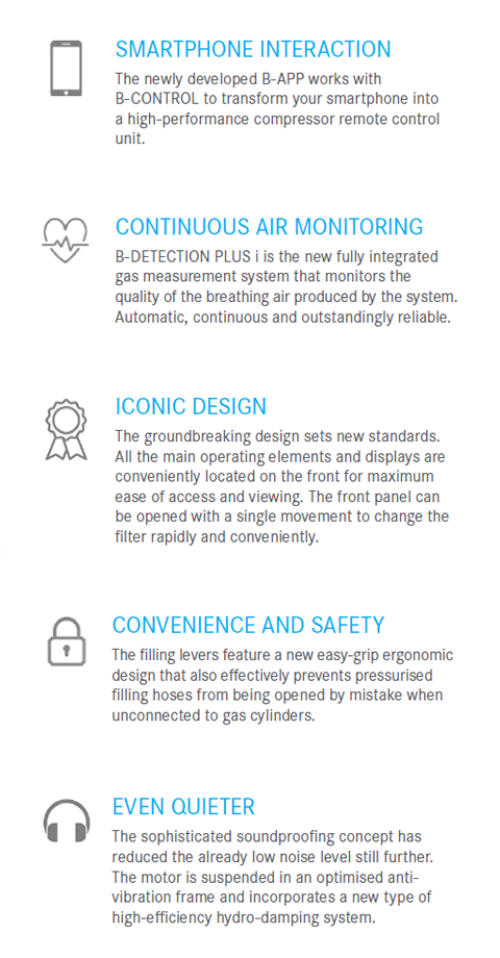 STATIONARY COMPRESSORS – REINVENTEDThe new MINI-VERTICUS & VERTICUS Series set the standards of the future for stationary high-pressure compres-sor systems. The series combines the quality and reliability of the preceding stationary compressor series with an all-new design, B-APP smartphone connection, online air quality monitoring and outstandingergonomic features.The new, extremely compact MINI-VERTICUS benefits particularly from BAUER’s signature design, whichenabled the maximum delivery volume of its top-end model to be increased by 20 percent to 320 l/min.In addition, numerous accessory models from the larger VERTICUS series, such as the B-CONTROL II control unit, are also available now.Complete with remote-control operat-ion and control using the B-APP (optional). With an ultra-reliable,high-precision smart internal online measurement system that monitors compliance with all toxin limit values1in the air and automatically shuts down the system in case of doubt.Significantly quieter to run. And with outstandingly ergonomic design and unparalleled ease of operation.More…
