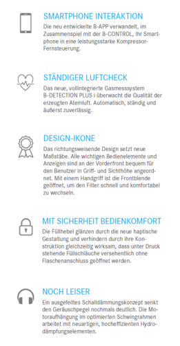 STATIONÄRE VERDICHTER - NEU ERFUNDENDie neue MINI-VERTICUS & VERTICUS Anlagenreihe setzt den künftigen Standard im Bereich stationärerHochdruck-Verdichteranlagen. Sie vereint die Qualität und Zuver-lässigkeit der bisherigen stationären Anlagenreihe mit komplett neuem Design, B-APP-Anbindung ans Smartphone, Online-Luftqualitätsmes-sung und hervorragender Ergonomie.Besonders der neue MINI-VERTICUS profitiert trotz seiner Kompaktheit von der Konstruktionsidentität: Die maxi-male Liefermenge des Spitzenmodells konnte um 20 Prozent auf 320 l/min gesteigert werden. Zudem: Zahlreiche Zubehörvarianten der größeren VERTICUS Reihe, beispielsweise die Steuerung B-CONTROL II, stehen jetzt ebenfalls zur Verfügung.Ausgestattet mit einer ferngesteuerten Bedienung und Kontrolle über die B-APP (optional). Mit einer intelli-genten, äußerst zuverlässigen und extrem exakten internen Online-messung, die rund um die Uhr die Einhaltung aller Schadstoffgrenzwerte1in der Luft überwacht und im Zweifel einen automatischen Anlagenstoppveranlasst.Mit einem deutlich leiseren Betrieb, mit hervorragender Ergonomie und einer Bedienerfreundlichkeit, die ihresgleichen sucht.Mehr…